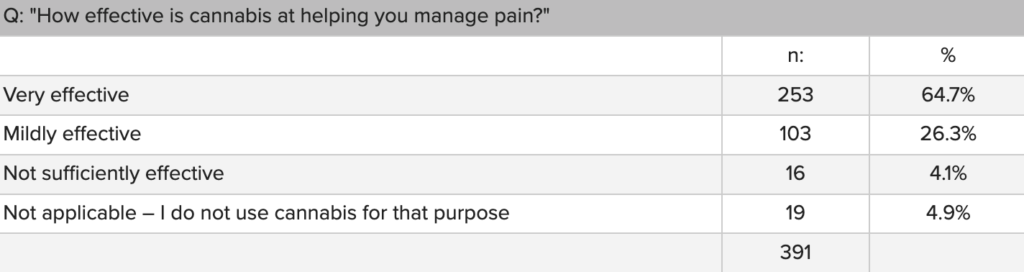 That includes about 65 percent who said it is “very effective” and 26 percent who said it’s “mildly effective” in pain management. Only four percent of respondents said marijuana it “not sufficiently effective” for chronic pain.