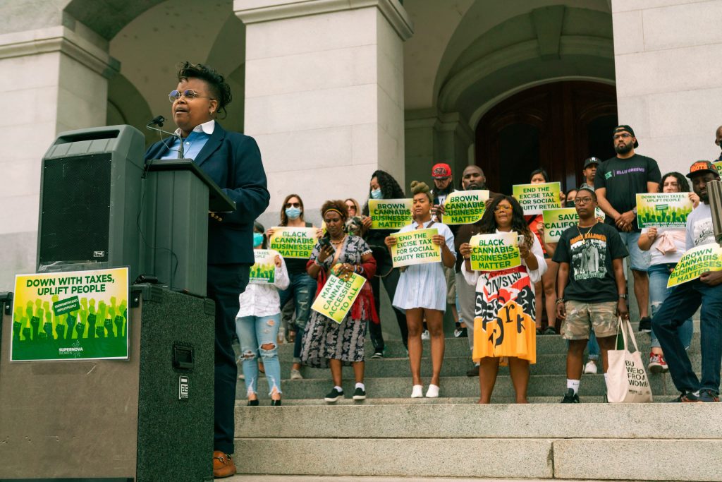 A group of licensed cannabis business owners rallied on the steps of the California capitol on Thursday to bring attention to the impact high cannabis taxes have on independent entrepreneurs. The demonstration, which was held in response to the proposed state budget released by Governor Gavin Newsom last month, was organized by Supernova Women, an Oakland nonprofit that works to create opportunities for Black and Brown people in the cannabis industry.