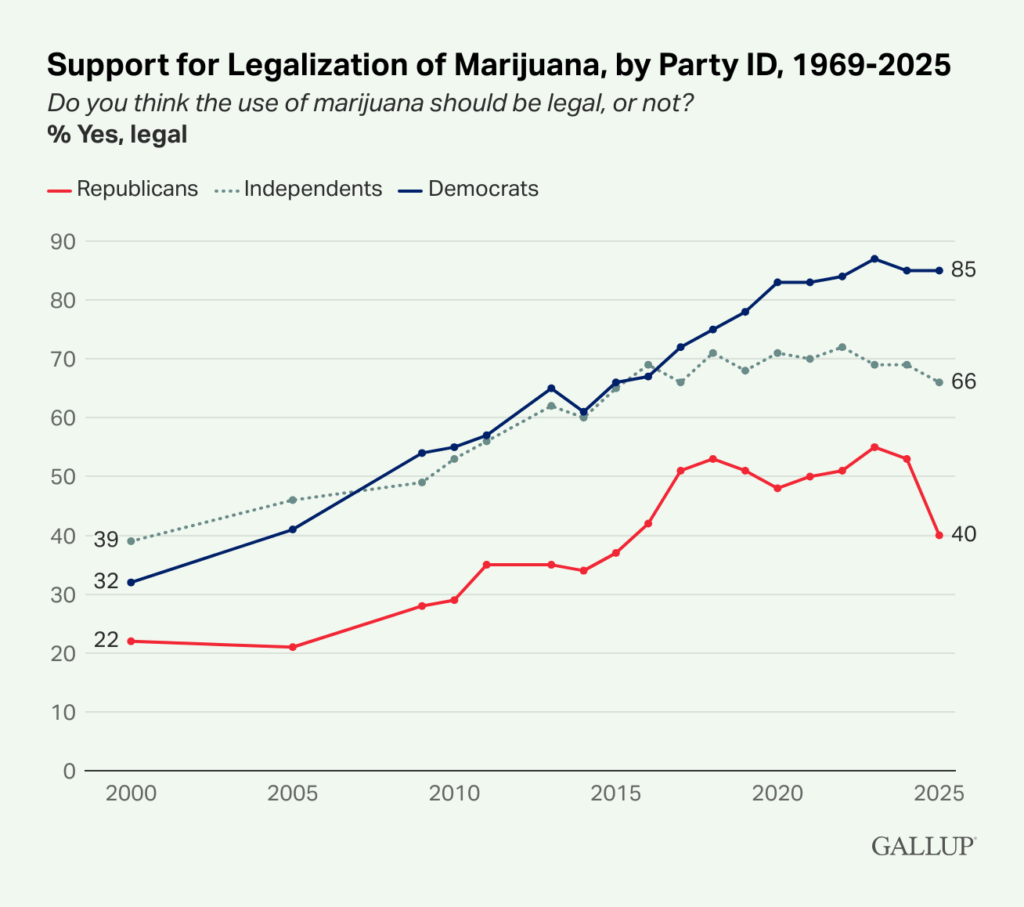 Overall, 64 percent of Americans now back ending cannabis prohibition. That’s 4 percentage points lower than Gallup’s 2024 results.