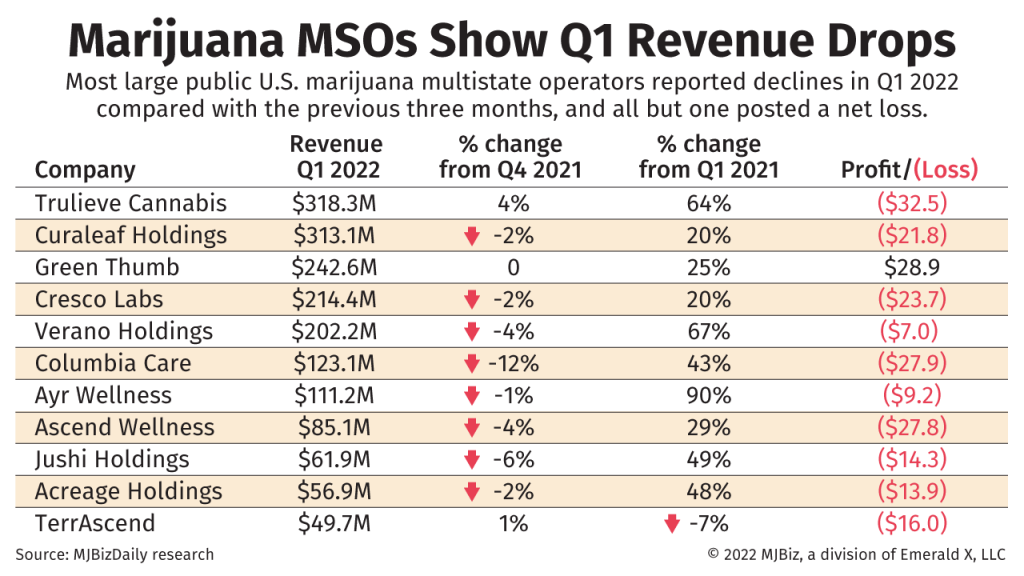 Of the 12 largest MSOs, only Illinois-based Green Thumb Industries posted a net profit for the first three months of 2022.