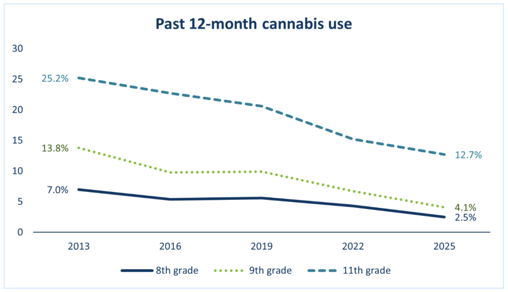 There has been a 57.7 percent statewide drop in self-reported past-year cannabis use from 2013 to 2025 among 8th, 9th and 11th graders combined. There has also been a decline over time