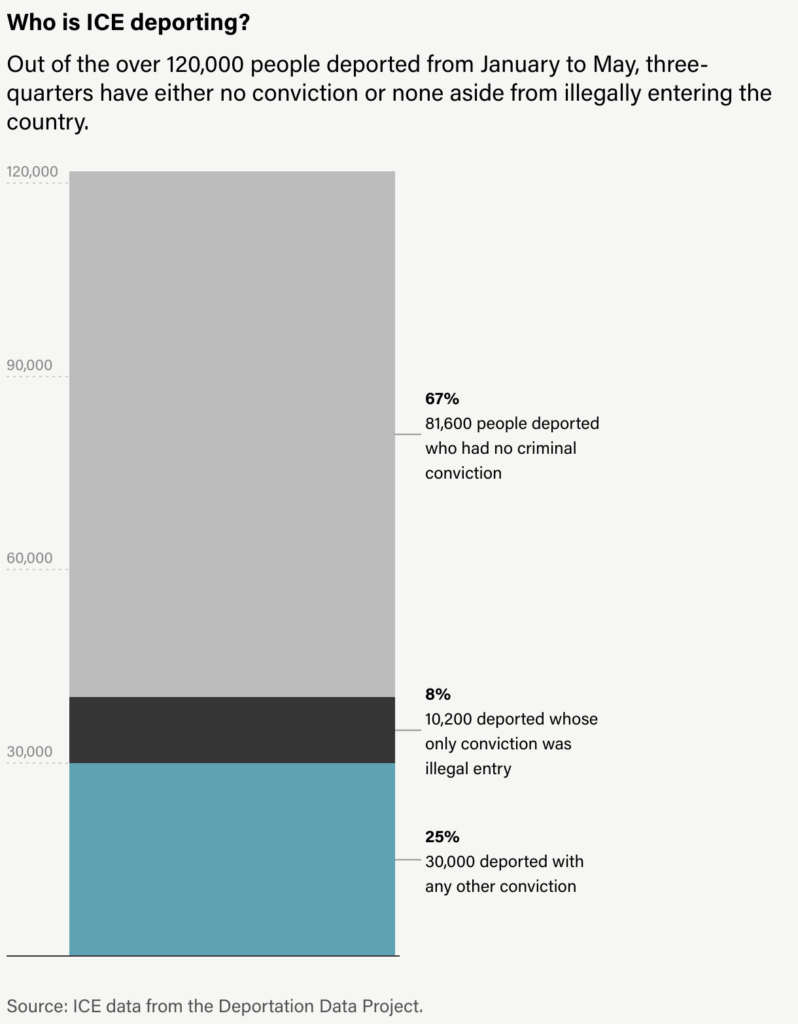 That risk has grown even greater for thousands of immigrant families under the Trump administration, as officials expand efforts to deport people with little or no criminal history. The monthly number of people deported whose most serious conviction was a traffic violation—such as driving without a license—has more than tripled in the last six months, hitting almost 600 in