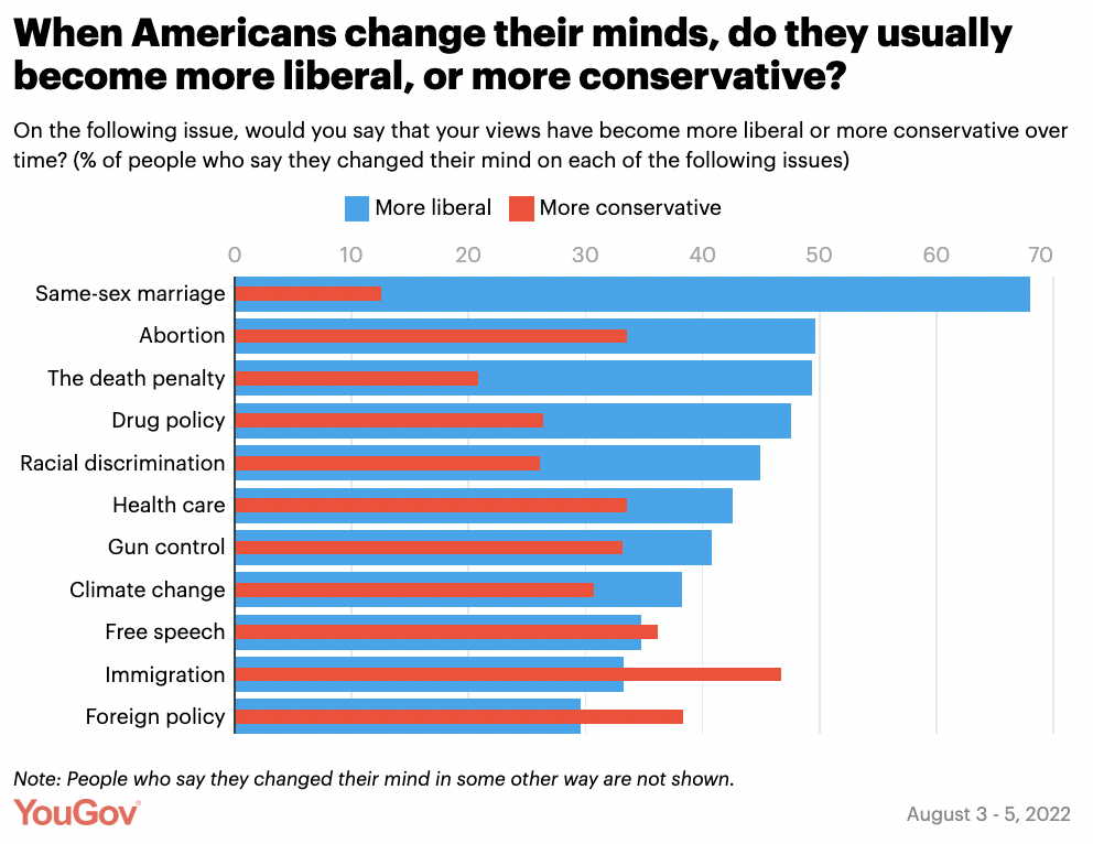 The YouGov survey looked at a variety of political issues, asking respondents to identify which topics they’ve changed their minds about, how their perspectives shifted on the political spectrum and what influenced them to think about the issue differently.