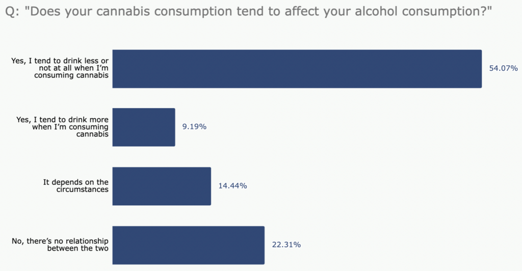 Asked how consuming marijuana affected their alcohol use, 54 percent of respondents said they “tend to drink less or not at all.” Another 22 percent said there wasn’t a relationship between use of the two substances, and 14 percent said it “depends on the circumstances.” Just 9 percent said they tended to drink more alcohol after using cannabis.